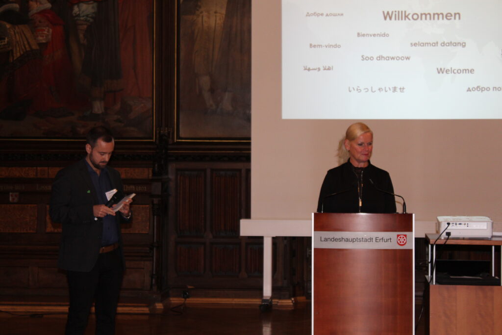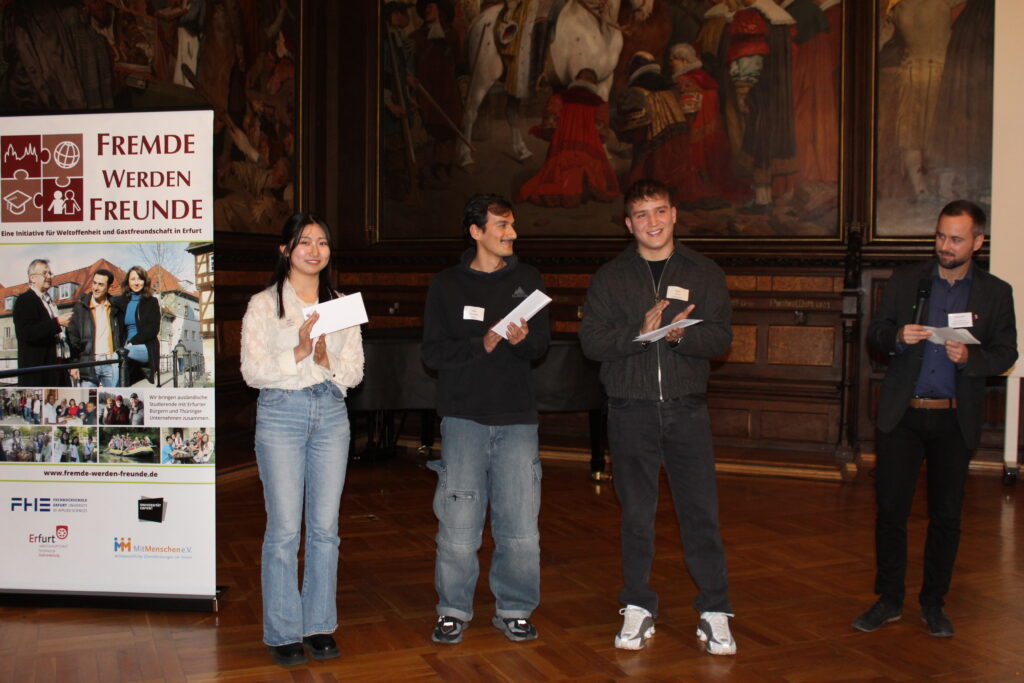 Die Feier wurde mit der schwungvollen Melodie des Liedes „La Cucaracha“ eröffnet,vorgetragen von Studierenden der Fachhochschule Erfurt. Die Atmosphäre war zugleich lebhaft und herzlich. In der Begrüßungsrede hießen die Oberbürgermeisterin der Stadt Erfurt, Heike Langguth, sowie die FwF-Leiterin Dana Kittel alle anwesenden internationalen Gäste willkommen. Die Oberbürgermeisterin betonte in ihrer Ansprache die Offenheit und Toleranz Erfurts gegenüber internationalen Talenten und würdigte die wichtige Rolle von Initiativen wie FwF bei der Förderung der gesellschaftlichen Integration. Anschließend stellte Dana Kittel die Ziele, Grundsätze und das breit gefächerte Kooperationsnetzwerk von „Fremde werden Freunde“ ausführlich vor.