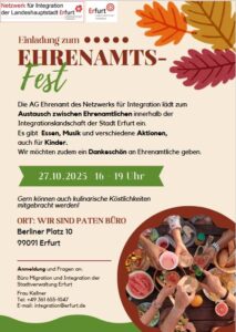 Termine AlleAnstehend20182019202020212022202320242025 Termin Informationen: Mo.27Okt.2025 Ehrenamtsfest16:00 UhrWir sind Paten Büro/ Berliner Platz 10Ehrenamtsfest Alle Paten sind herzlich eingeladen: Anmeldung direkt bei: integration@erfurt.de